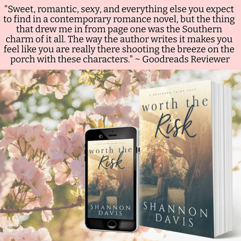 A military wife and mother of three college-aged children, she and her husband reside in Georgia with their three dogs and four cats. When she is not writing, Shannon enjoys traveling, baking, and outdoor activities. An avid reader of women’s fiction and love stories, she is a sucker for happy endings. Her love of the south coupled with romance is evident in her novels, Worth the Risk and Worth the Wait, books one and two in the Southern Fairy Tale series.